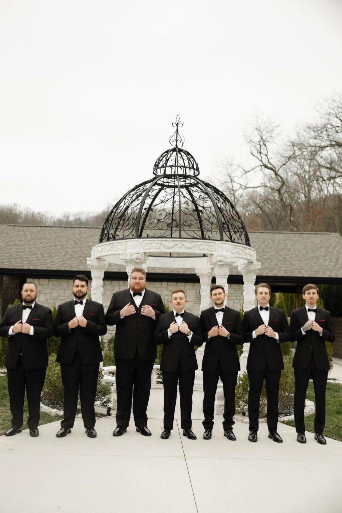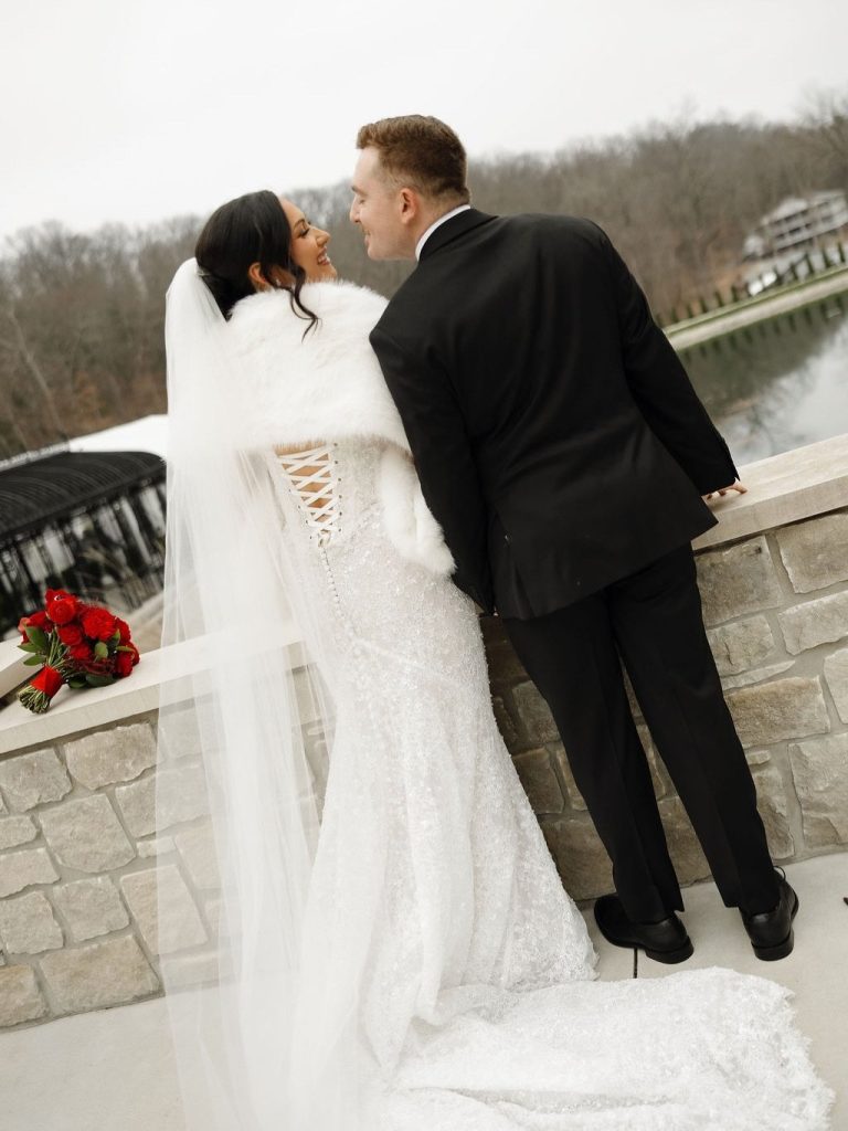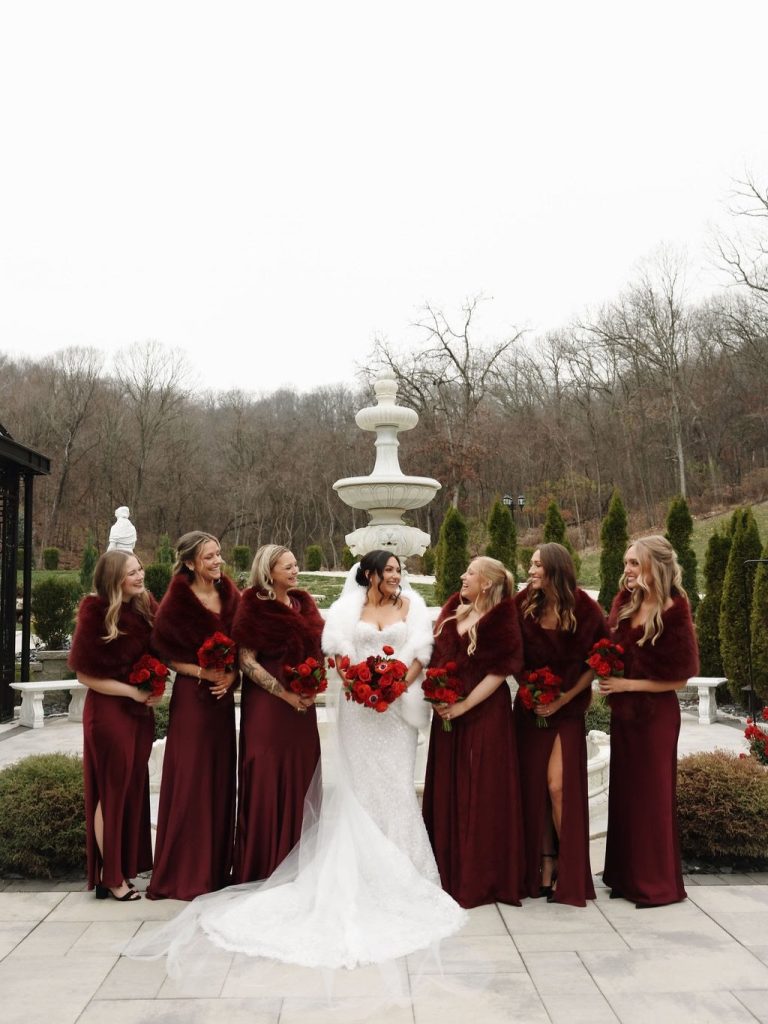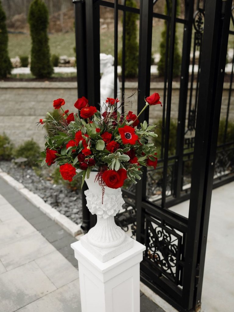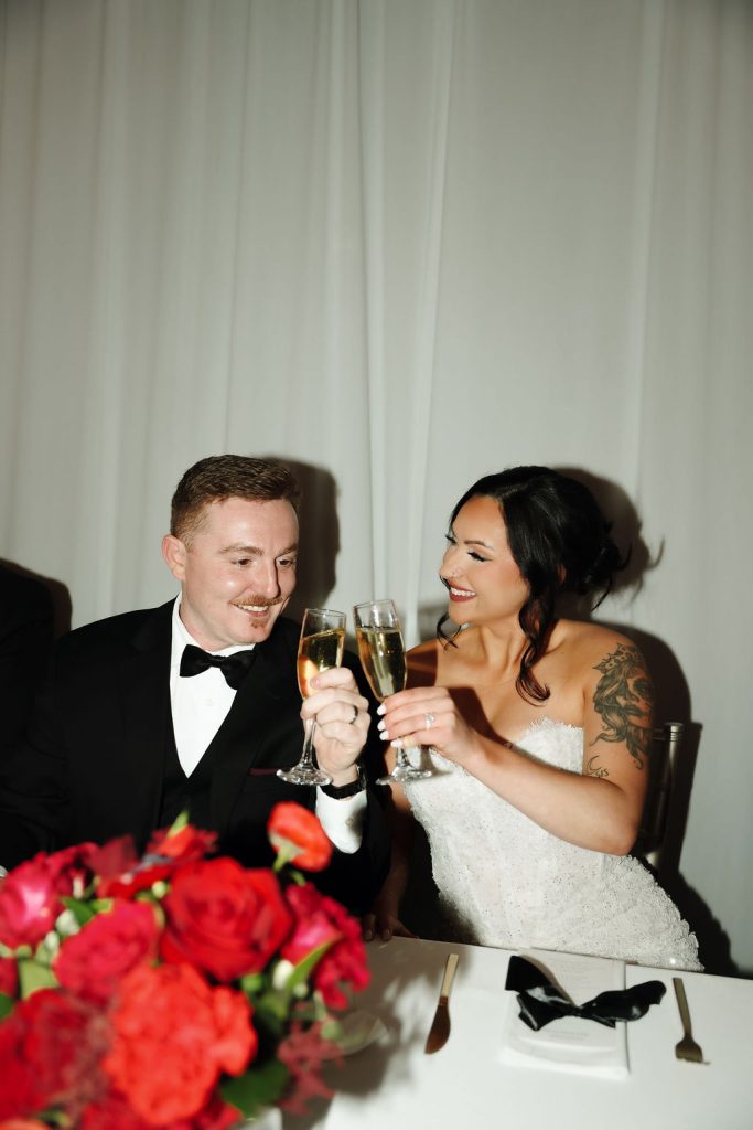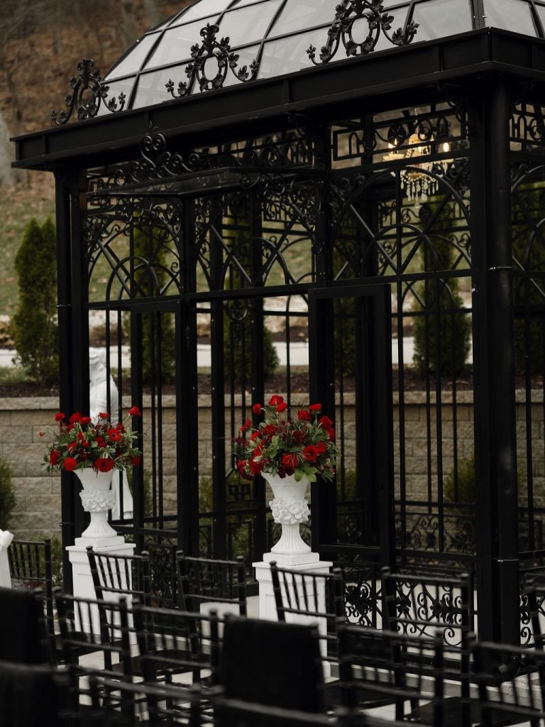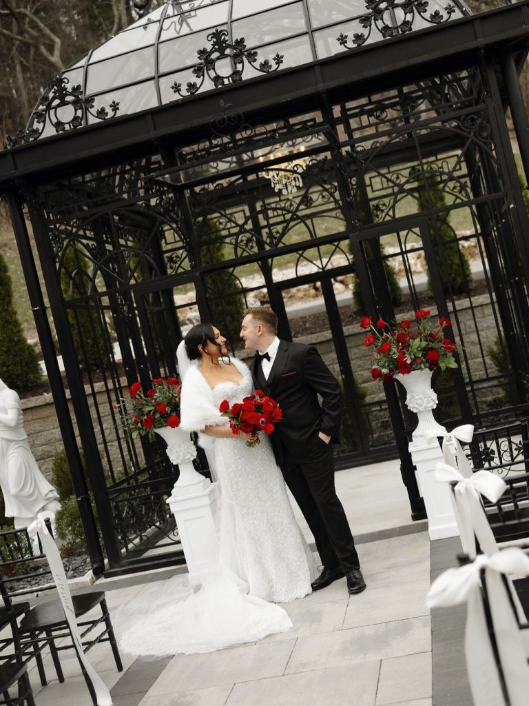 There is something truly magical about a winter wedding, and Ali and Bryan’s recent nuptials at Knotting Hills were no exception. Their celebration offered the perfect blend of modern sophistication with a bold, romantic twist that warmed up the chilly season. The outdoor ceremony space featured a stunning black iron conservatory with intricate glass detailing, providing a grand, architectural backdrop for their “I dos”. The atmosphere was elevated by breathtaking floral designs from Flora Milou, which brought a vibrant pop of passion and warmth through deep red roses and anemones.