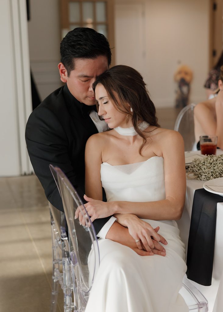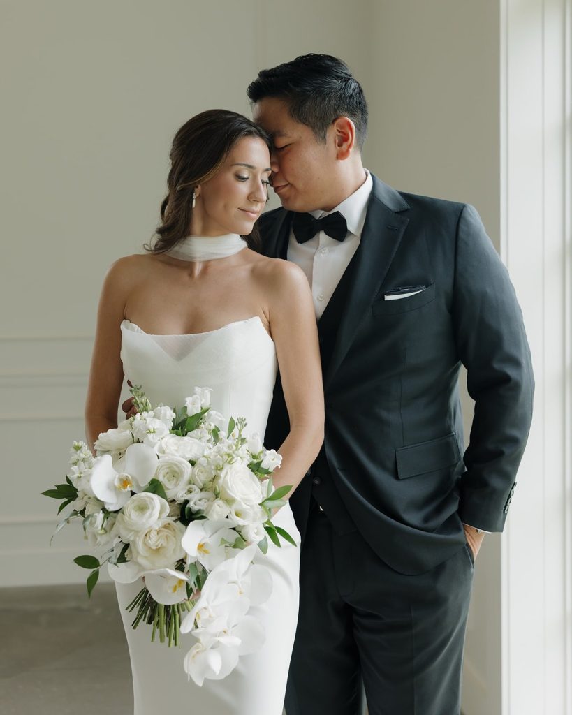 Becca and James’s stunning wedding was a masterclass in the “less is more” aesthetic, where sleek sophistication met modern romance. The day was defined by a crisp white and noir palette, allowing every intentional detail to shine against a clean, monochromatic backdrop. Becca was a vision in a sculptural gown paired with a chic sheer neck scarf—a nod to high-fashion bridal trends that we simply can’t get enough of. This bold choice highlighted the beauty of clean lines and timeless silhouettes that never go out of style. Beyond the editorial-worthy design, the atmosphere was filled with the warmth of a love that truly endures. Cheers to the new Mr. and Mrs. Chang on a beautiful beginning!