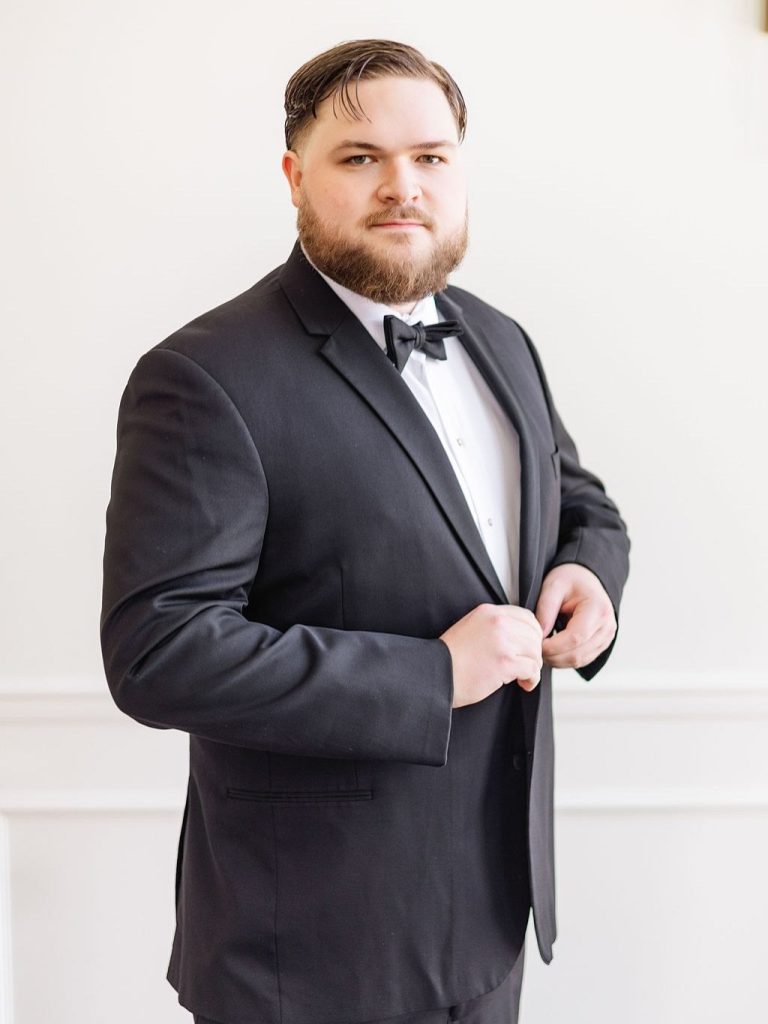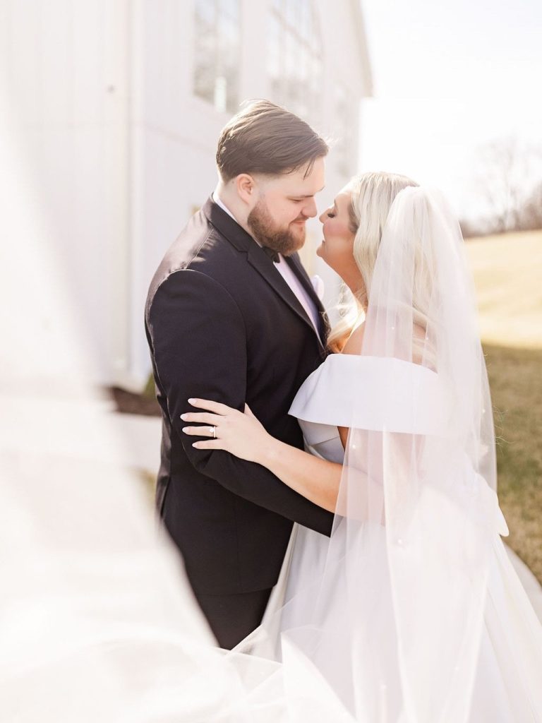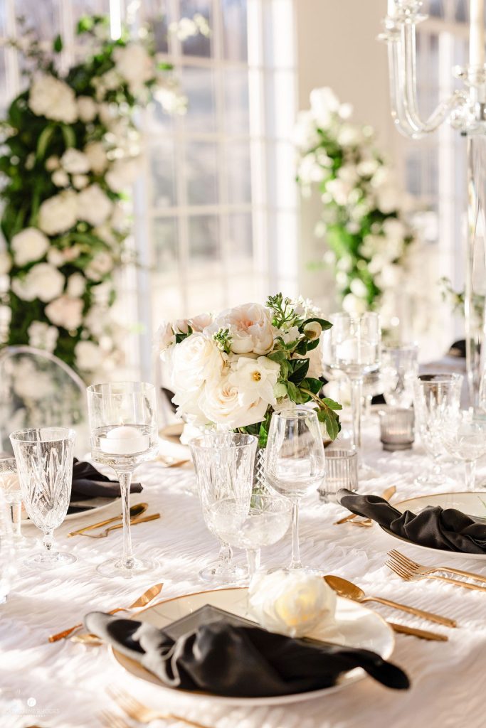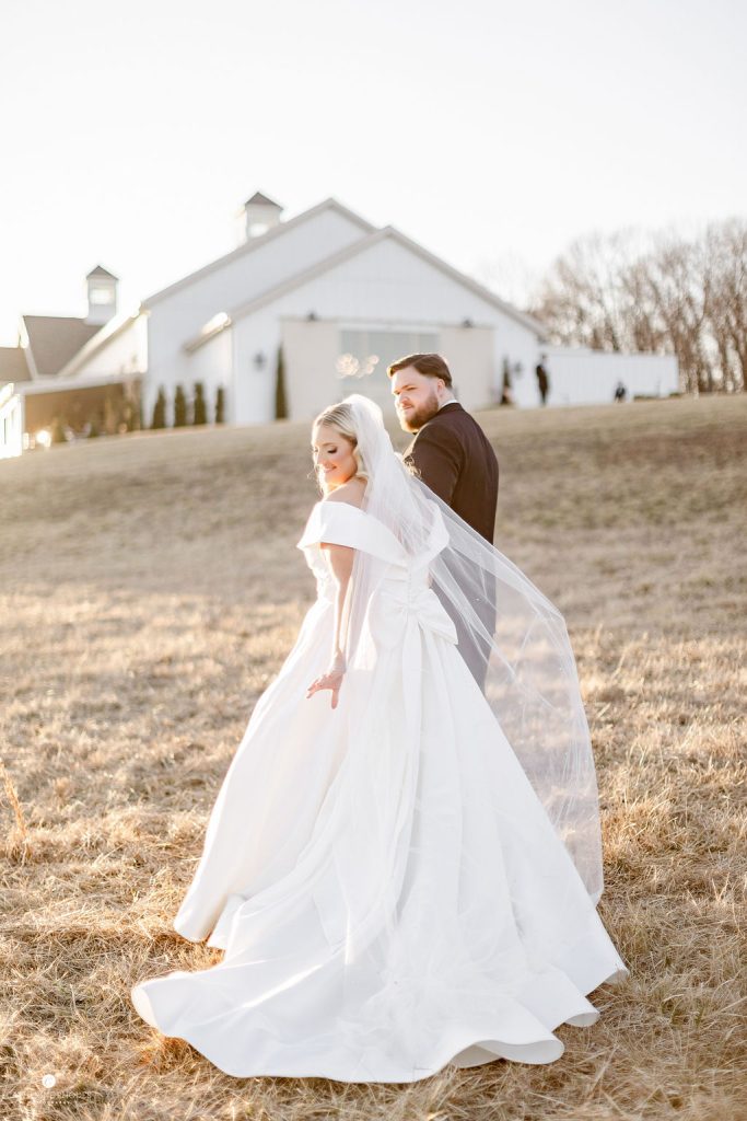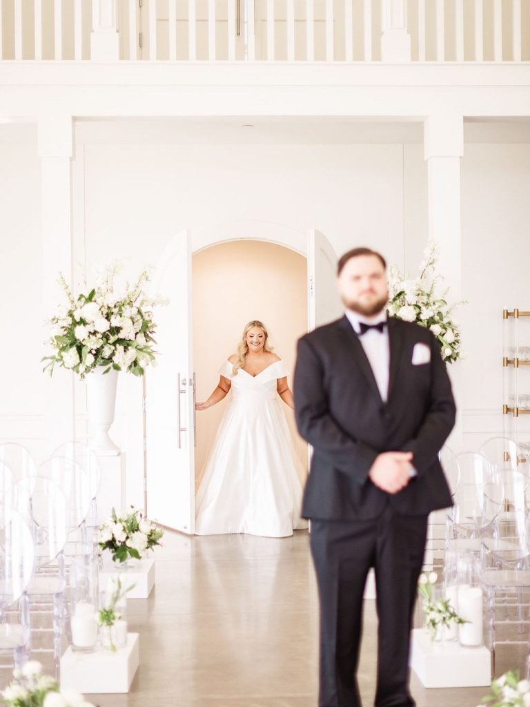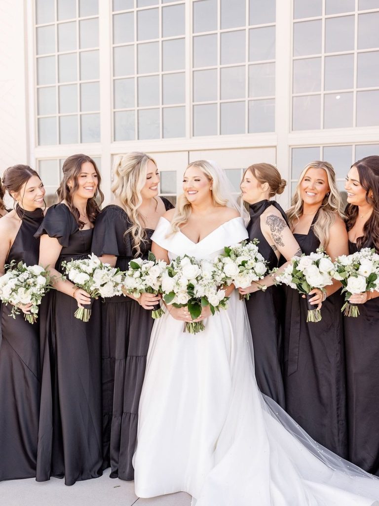 The crisp transition from late winter to early spring provided the most romantic backdrop for Emily and Luke’s breathtaking wedding, a day defined by timeless elegance and radiant light. Emily was a vision in her stunning off-the-shoulder Mia Grace Bridal gown, adorned with a dramatic bow and a delicate, shimmering veil. Luke looked dapper in a classic black tuxedo, matching the sophisticated aesthetic of their wedding party, dressed in chic black attire. Every detail was meticulously planned, from the personalized vow books to the lush white floral pillars that framed the altar.