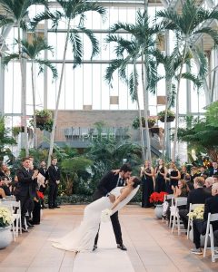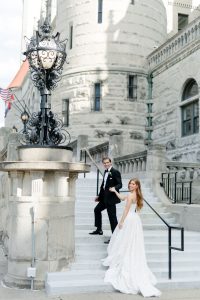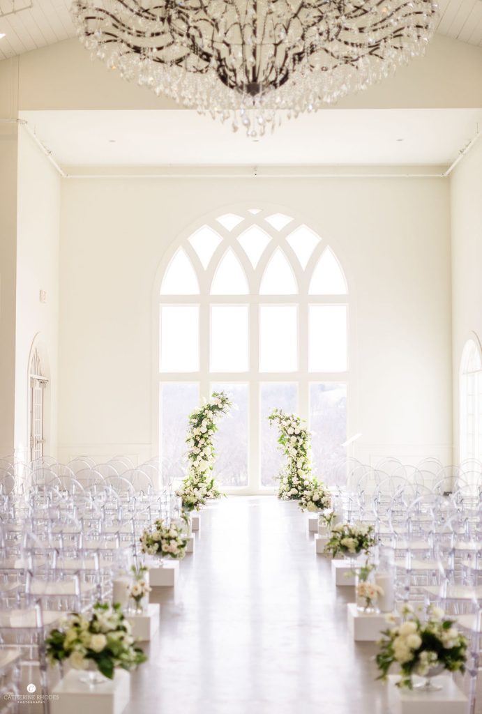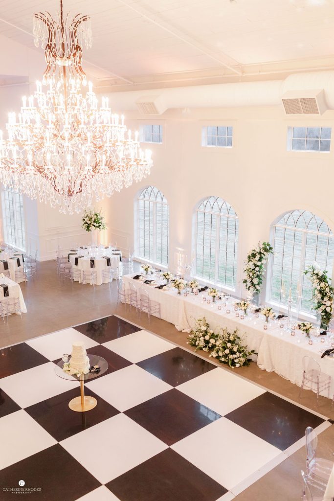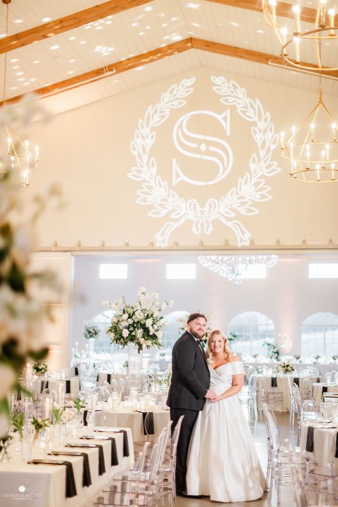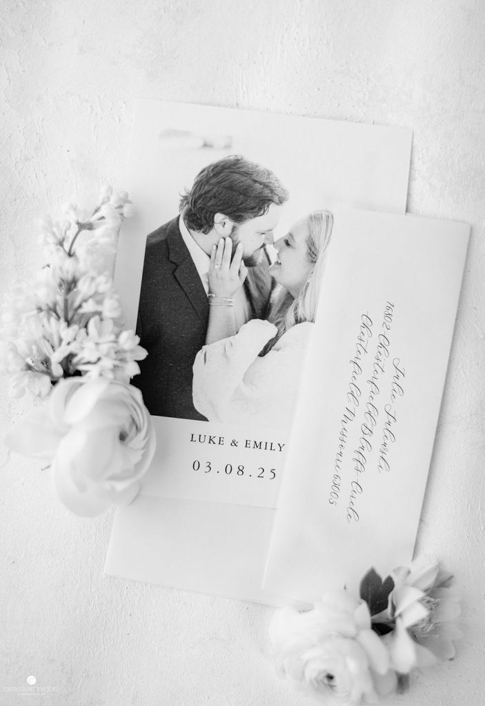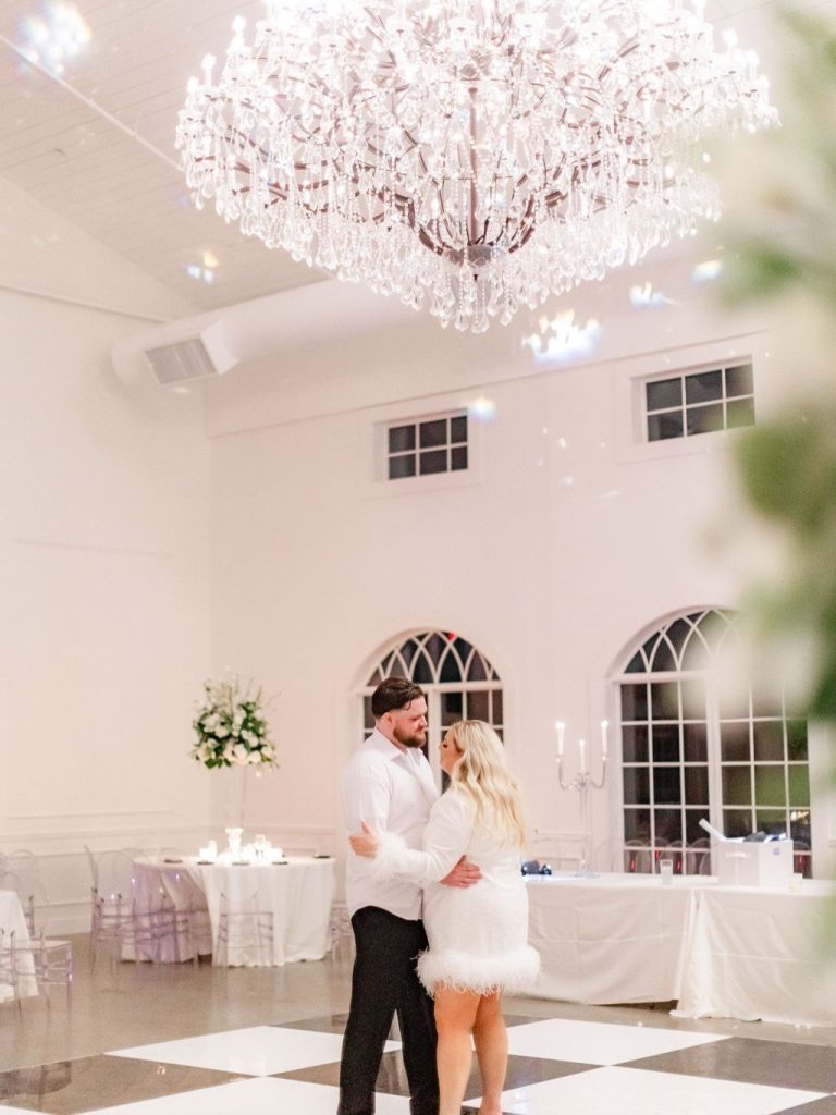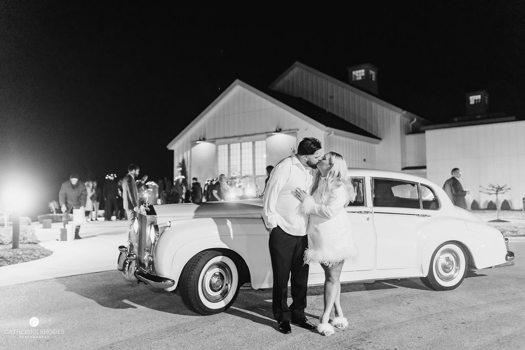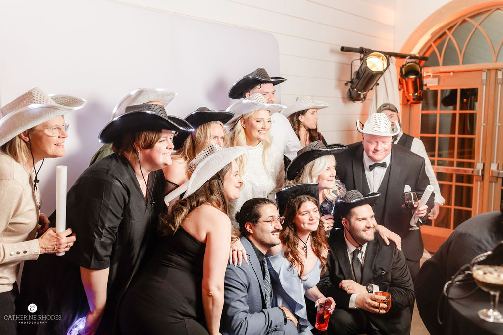 The reception transformed the space into a high-glamour ballroom, complete with a classic black-and-white checkered dance floor and a custom monogram projected on the wall. As the night evolved, the energy shifted to pure fun, with guests donning glittering sequined cowboy hats to dance the night away. Before the final farewell, the couple shared a romantic private last dance under the grand crystal chandelier. For the festivities’ finale, Emily made a stylish wardrobe change into a playful white sequined mini dress finished with feathers. The day ended with a magical sparkler send-off, where friends and family lined the path to cheer for the newlyweds. Waiting to whisk them away was a stunning vintage Rolls-Royce, the perfect classic touch to end their modern fairytale. Catherine Rhodes Photography captured every heartfelt moment, ensuring the new Mr. and Mrs. Shields have a lifetime of memories from their perfect spring day.
