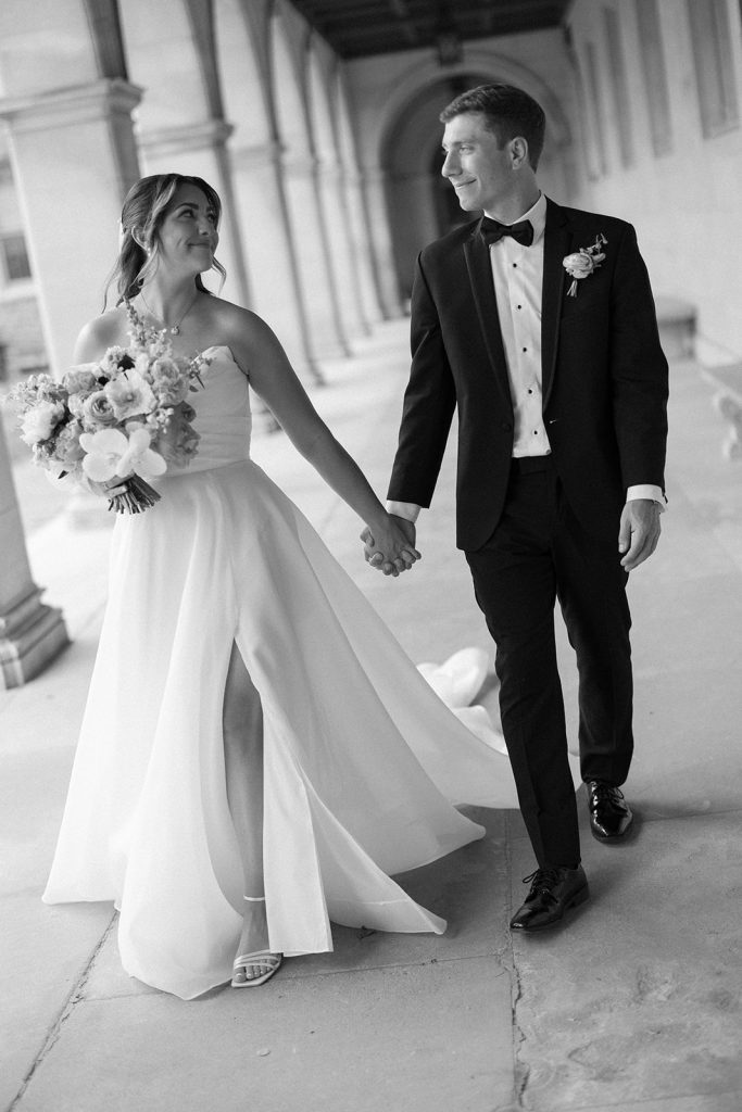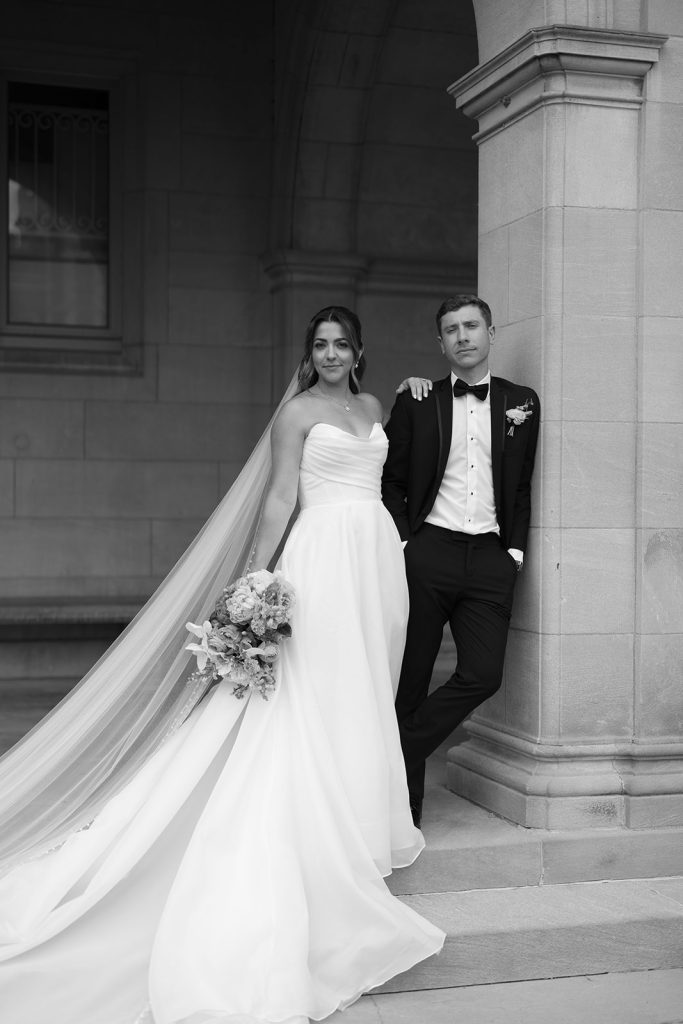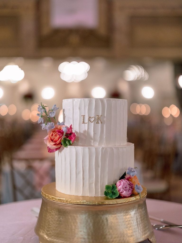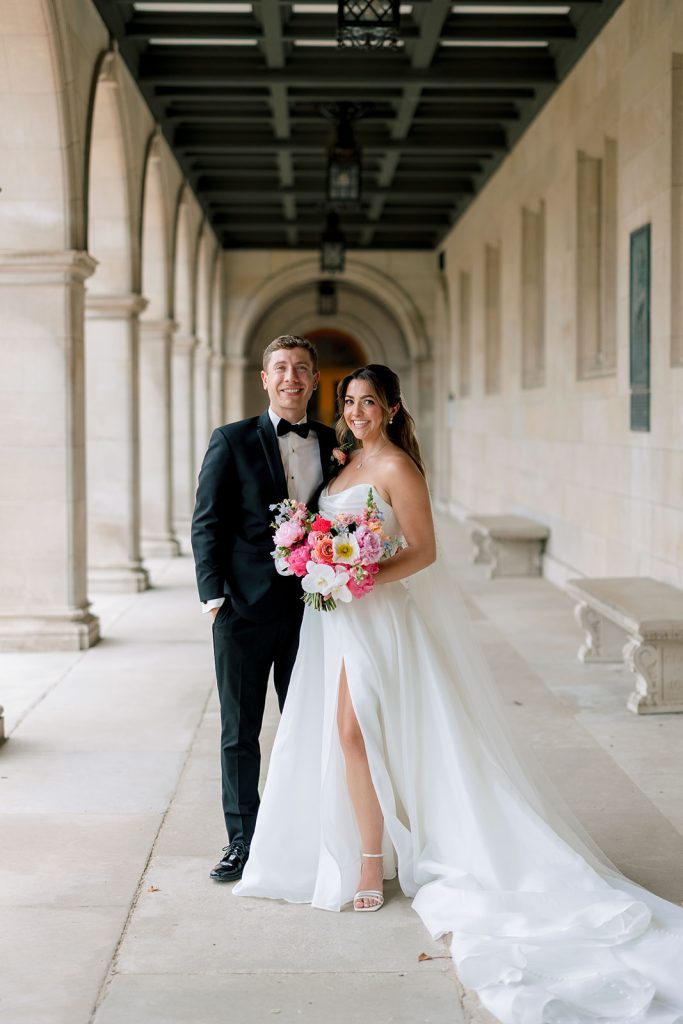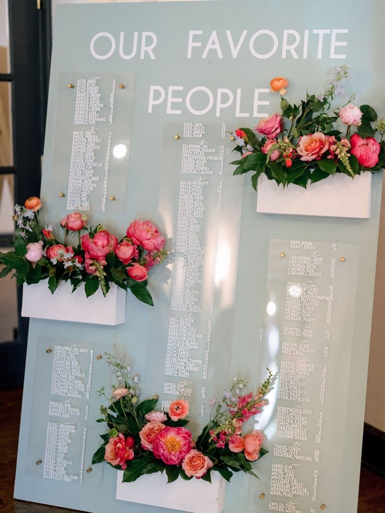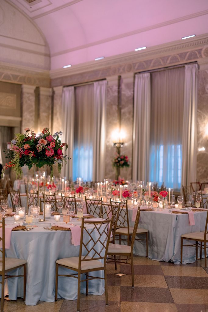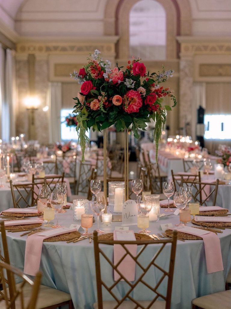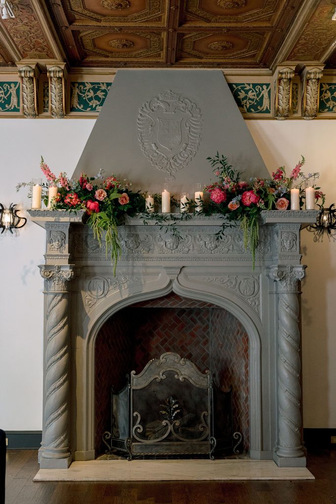 Lauren and Kevins’s wedding was a stunning blend of historic elegance and vibrant, modern romance, perfectly defined by their gorgeous floral design executed by Roses + Mint. Towering centerpieces featuring roses and peonies brought dramatic flair and height to the reception space. The floral artistry extended beyond the tables, transforming the venue’s carved stone fireplace with elegant swags of greenery and flowers. Even the seating chart was softened by white planter boxes overflowing with bright pink blooms.