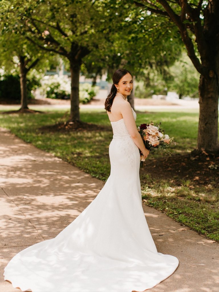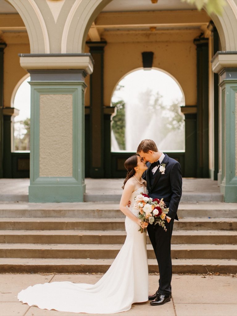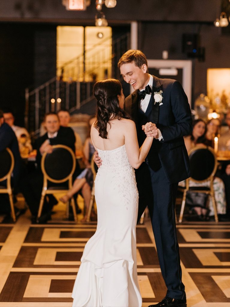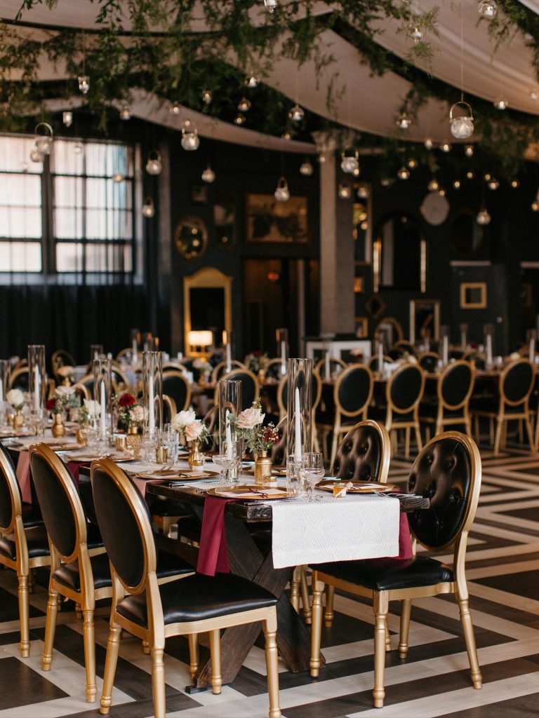 Maddie and Logan brought the outdoor garden party vibes indoor with this beautiful reception held at The Leona. We love the moody feel of this spring wedding. The wedding featured stunning burgundy and peach florals and a personalized bookcase at the reception. Congrats to the beautiful couple!