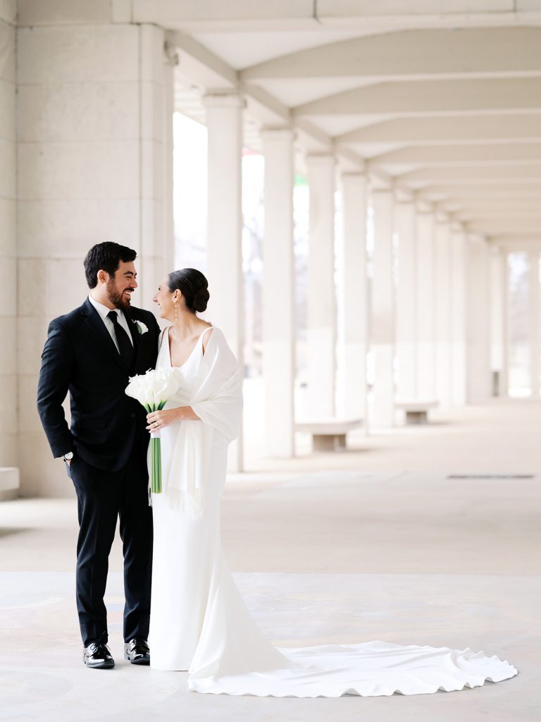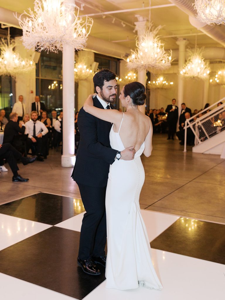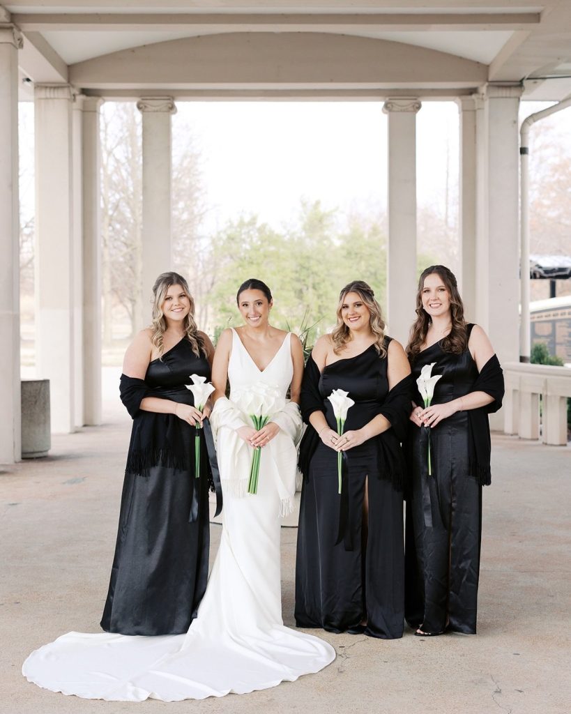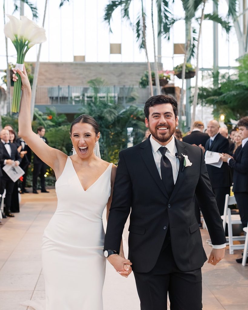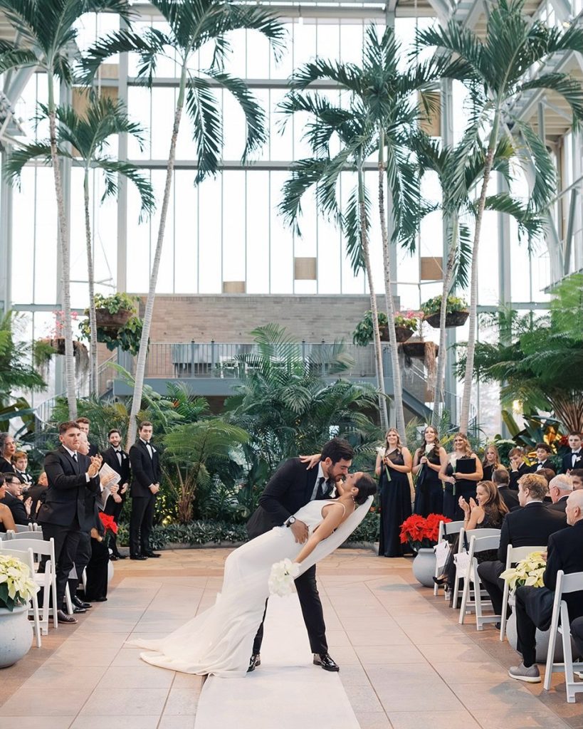 Maggie and Jared’s wedding at The Jewel Box in Forest Park was a breathtaking fusion of modern minimalism and timeless romance. The bride was radiant in a sleek, v-neck gown paired with an architectural bouquet of white calla lilies, while the groom looked dapper in a classic black suit. Their celebration leaned into a sophisticated monochromatic palette, featuring a striking checkered dance floor and classic black-and-white tablescapes beneath the warm glow of dramatic chandeliers.