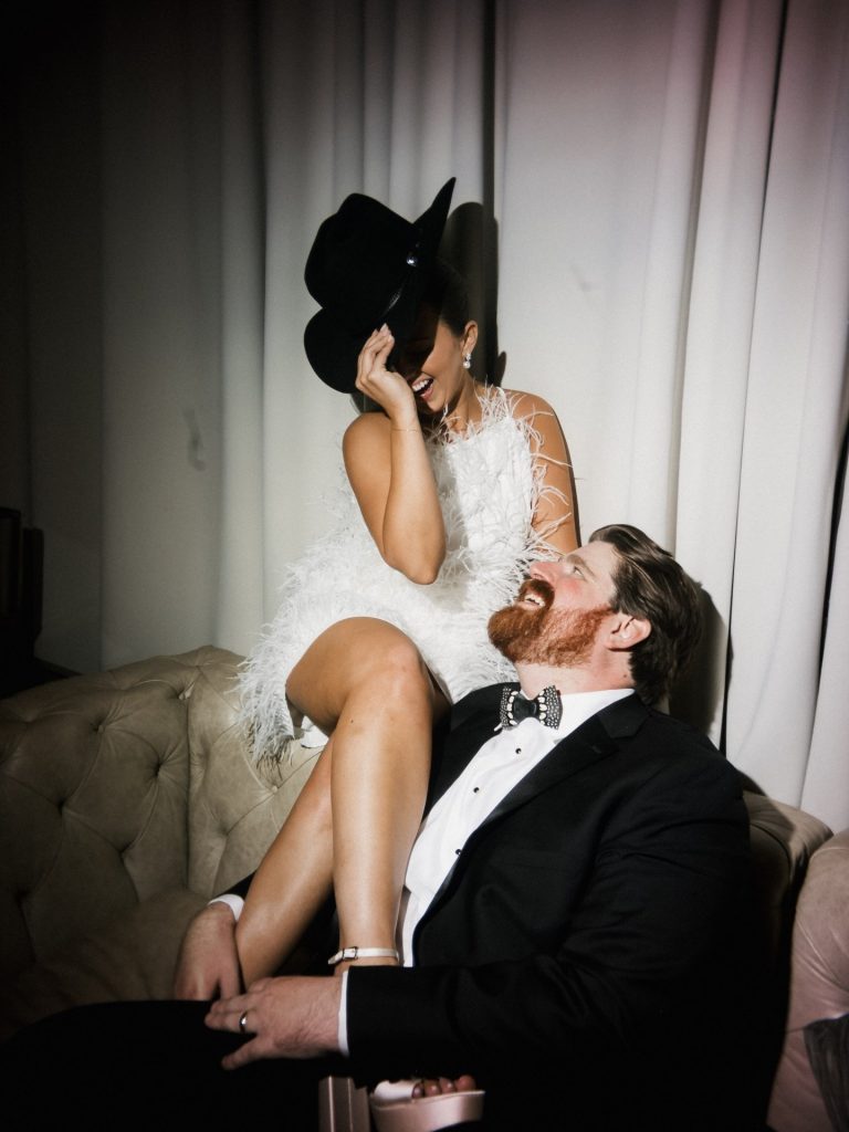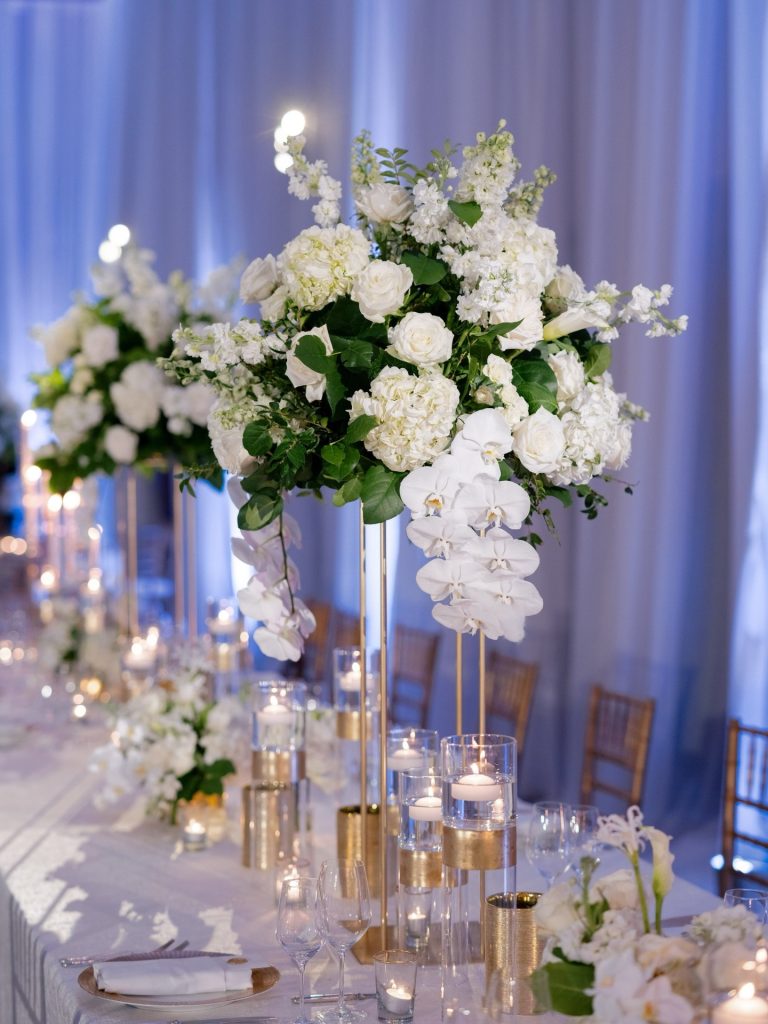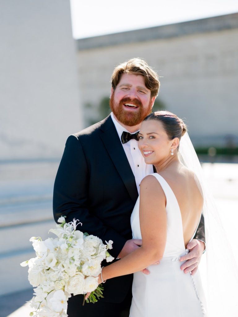 The celebration kicked off with a champagne toast framed by the iconic Gateway Arch, setting a sophisticated tone for the festivities to follow. As the evening transitioned into the grand ballroom at The Four Seasons Hotel St. Louis, the space transformed into a sanctuary of high-fashion glam and classic St. Louis magic. We were particularly captivated by the couple’s choice of a sleek black-and-white palette, which provided a timeless backdrop for the towering white floral arrangements. Every detail felt intentionally curated to balance contemporary style with grand-scale romance. Congratulations to the new Mr. and Mrs!