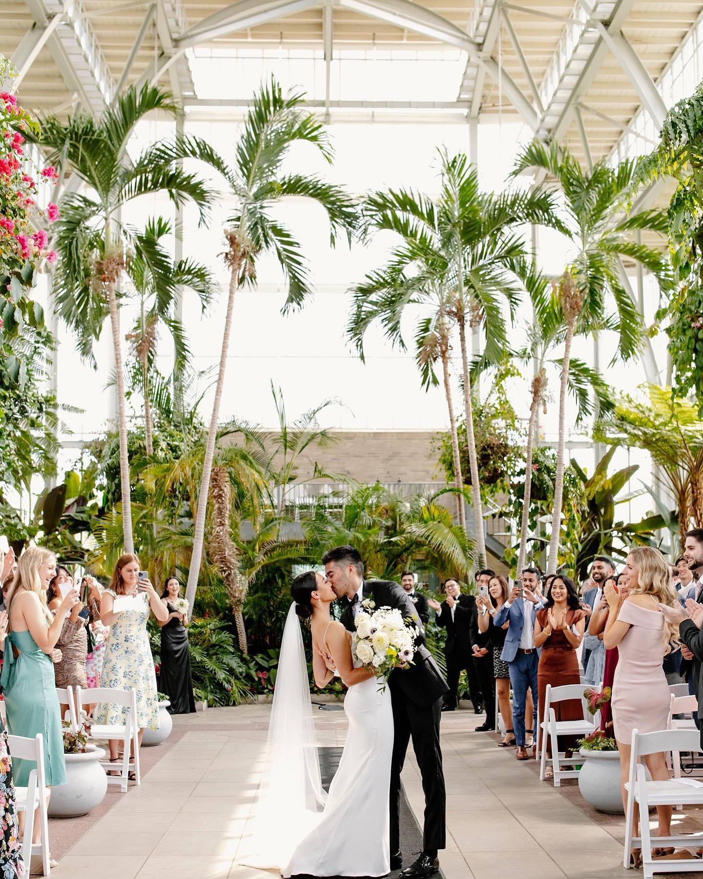 The Jewel Box in Forest Park is a stunning, Art Deco-greenhouse wedding venue that blends historic charm with lush greenery. Originally built in 1936 and restored in a major renovation, it features towering glass walls, tropical plants, seasonal floral displays, and a radiant fountain (which can also be removed for ceremonies or receptions). With a 50-foot high ceiling and an interior space that holds up to 250 for ceremonies, this venue offers beautiful natural light combined with modern climate control, making it perfect whether the weather’s hot or cold.