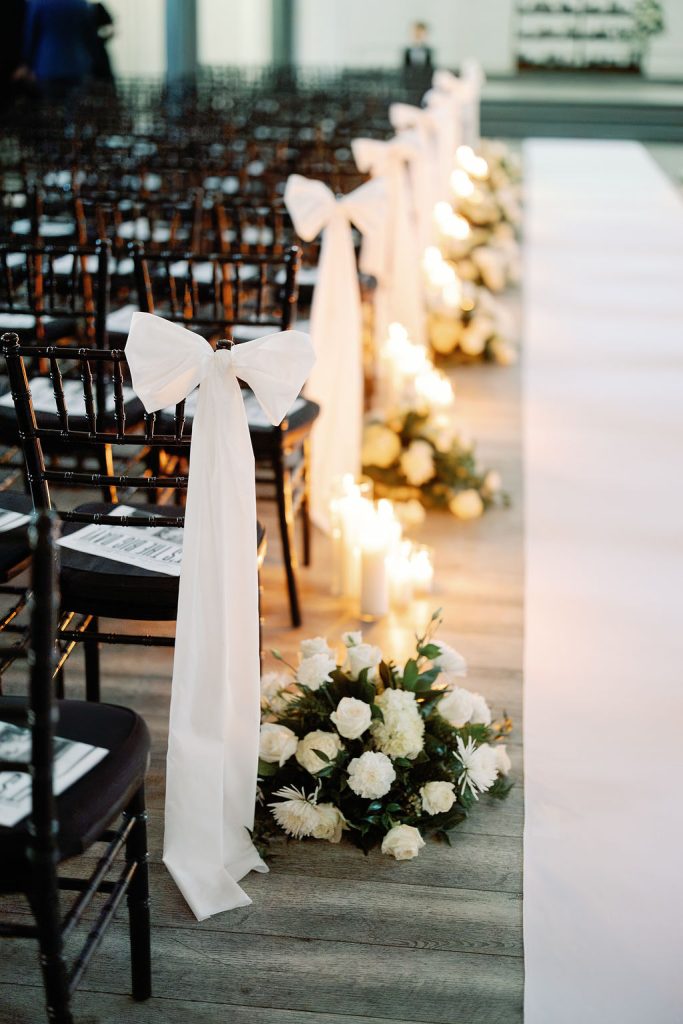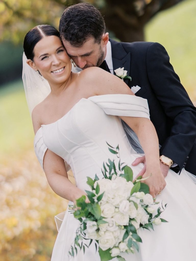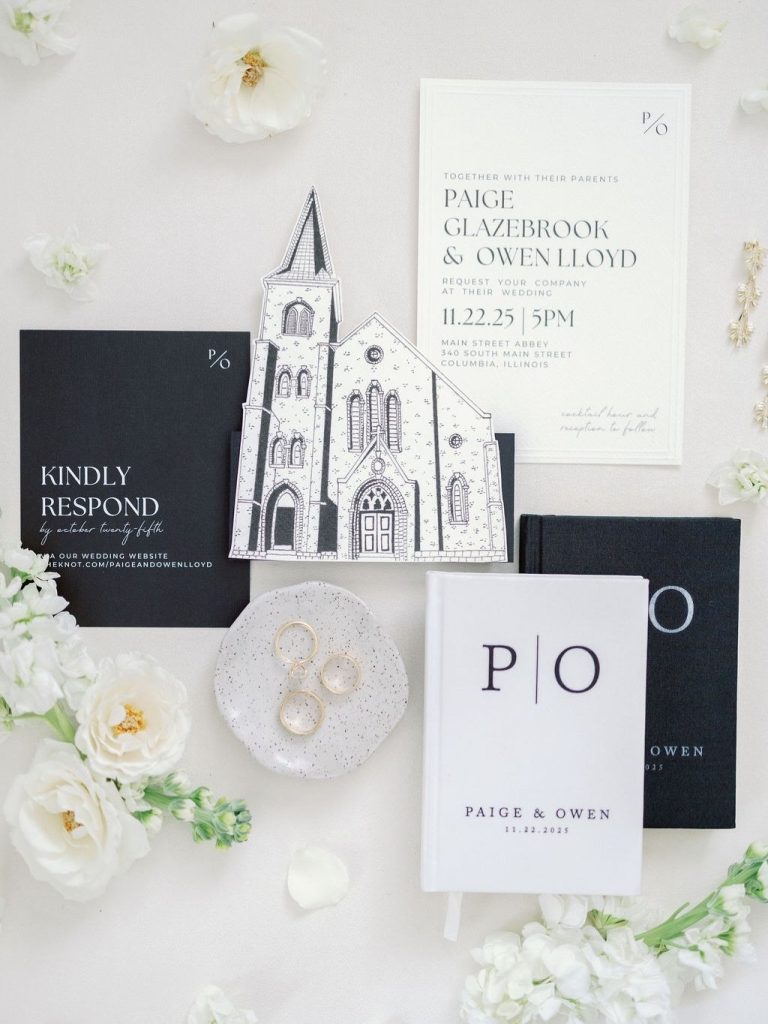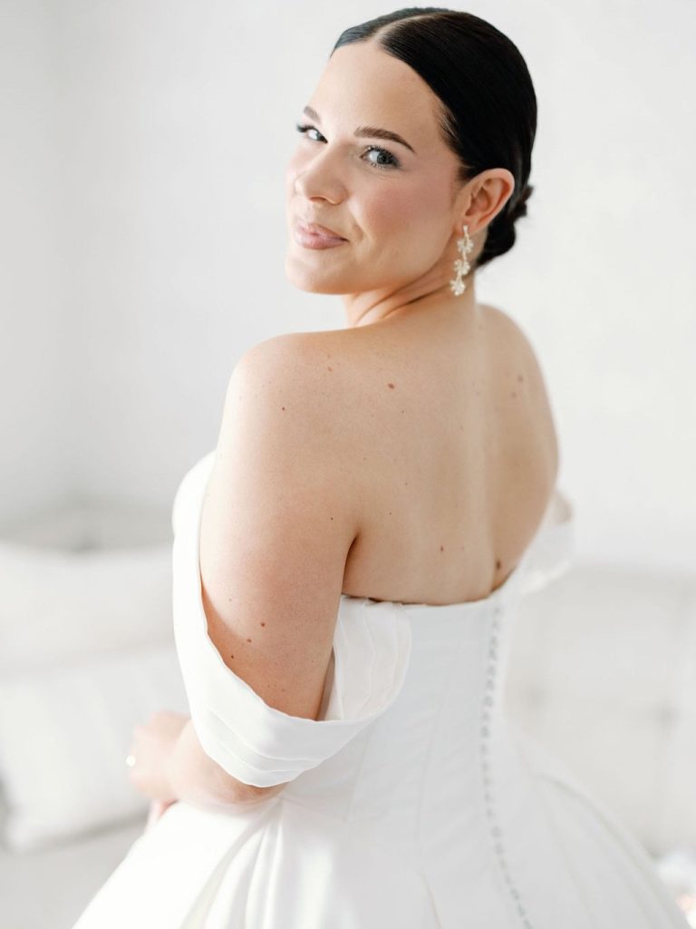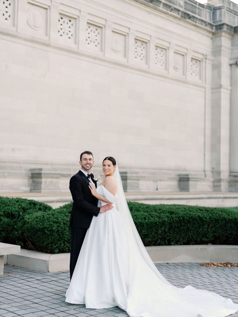 Paige and Owen’s Fall wedding was far more than a traditional black-and-white ceremony; it was a profound testament to creativity, intentionality, and personal connection. The couple transformed their celebration into a living gallery, centered around a display of handmade artistry. Paige stole the show, appearing radiant in an architectural ballgown from Mia Grace Bridal that perfectly complemented the day’s sophisticated aesthetic.