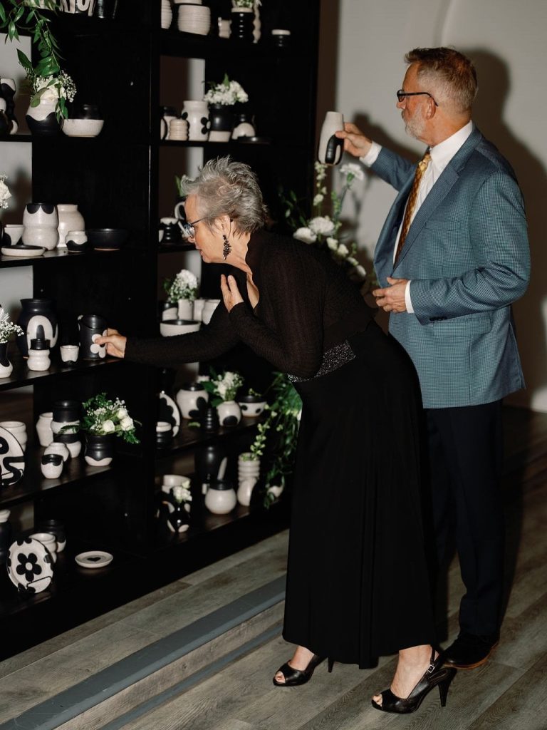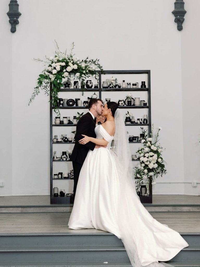 However, the most remarkable detail was the ceremony backdrop, which Paige crafted herself by hand-throwing 170 unique pieces of pottery. These vessels served as a soulful setting for their vows before being gifted to guests as meaningful, one-of-a-kind keepsakes. Every element of the day, from the structured lines of the bridal fashion to the organic textures of the ceramics, felt elegant and artistic. By weaving their personal passions into the fabric of the event, Paige and Owen created an unforgettable experience for everyone in attendance.