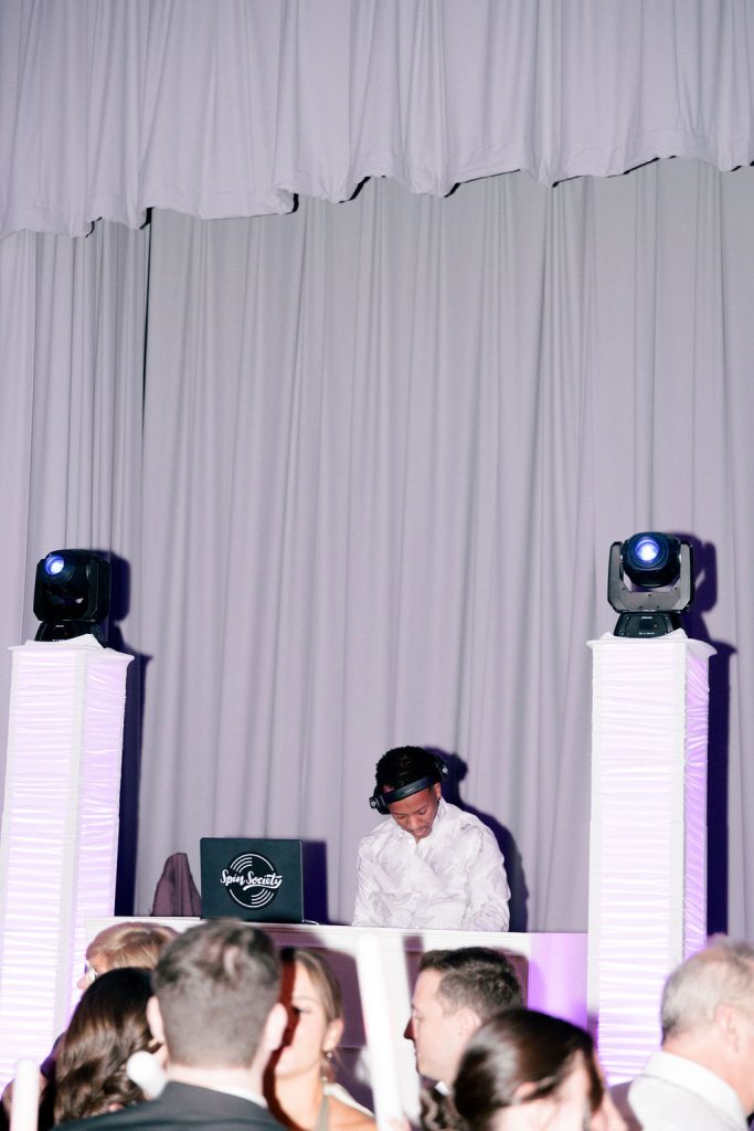 Spin Society DJs utilize custom DJ booths and large wooden facades to ensure their setup is visually impressive and complements the wedding aesthetic. They also provide essential services to ensure a seamless celebration, including additional sound for cocktail hours in separate rooms.