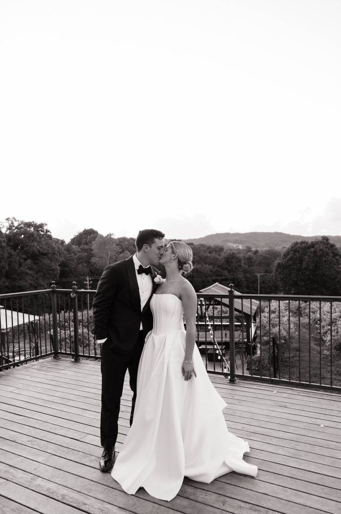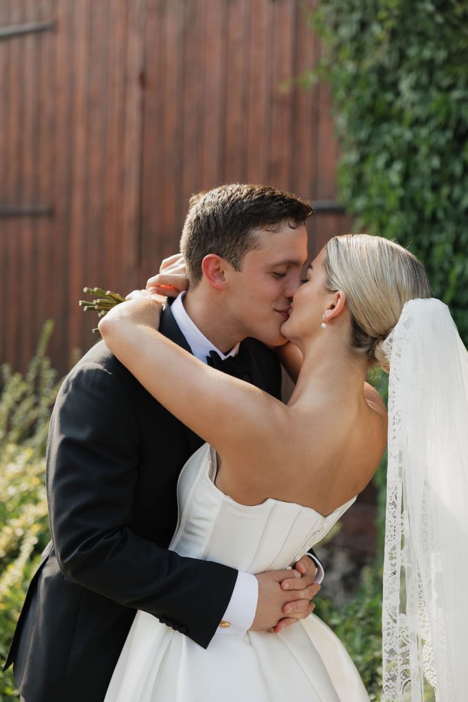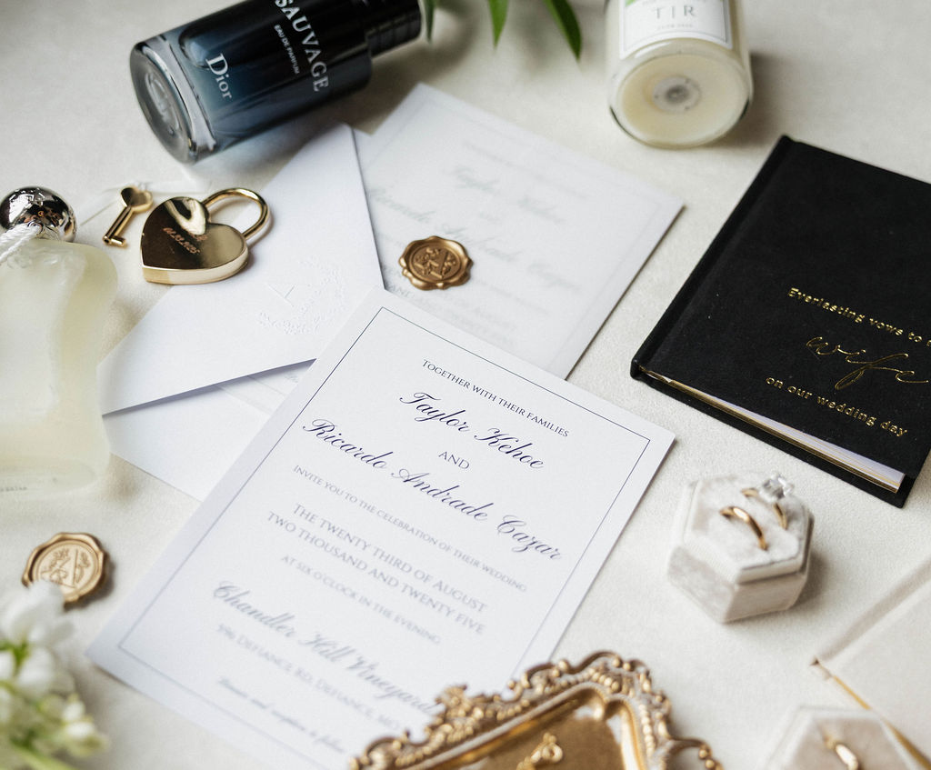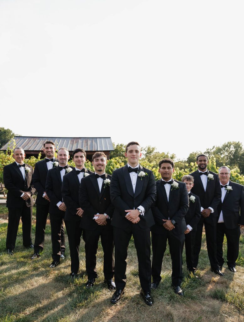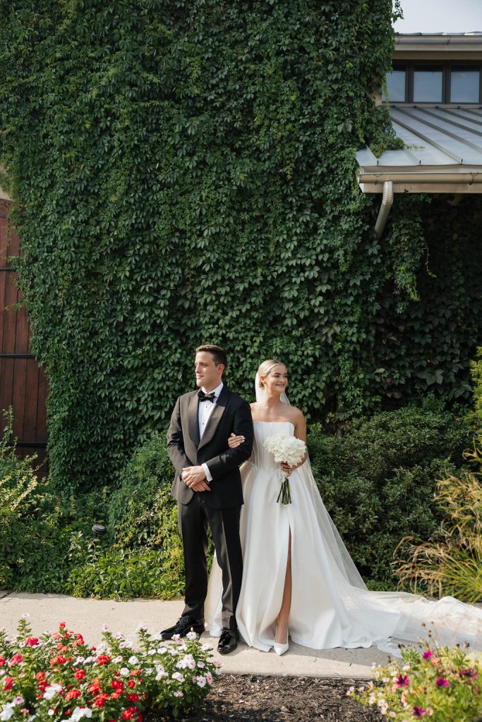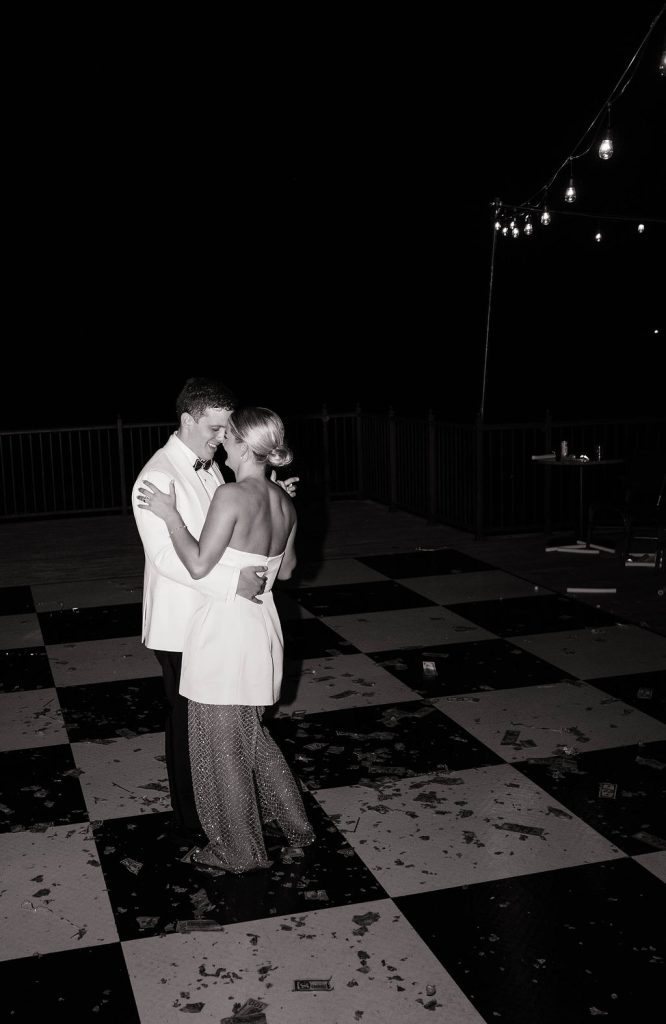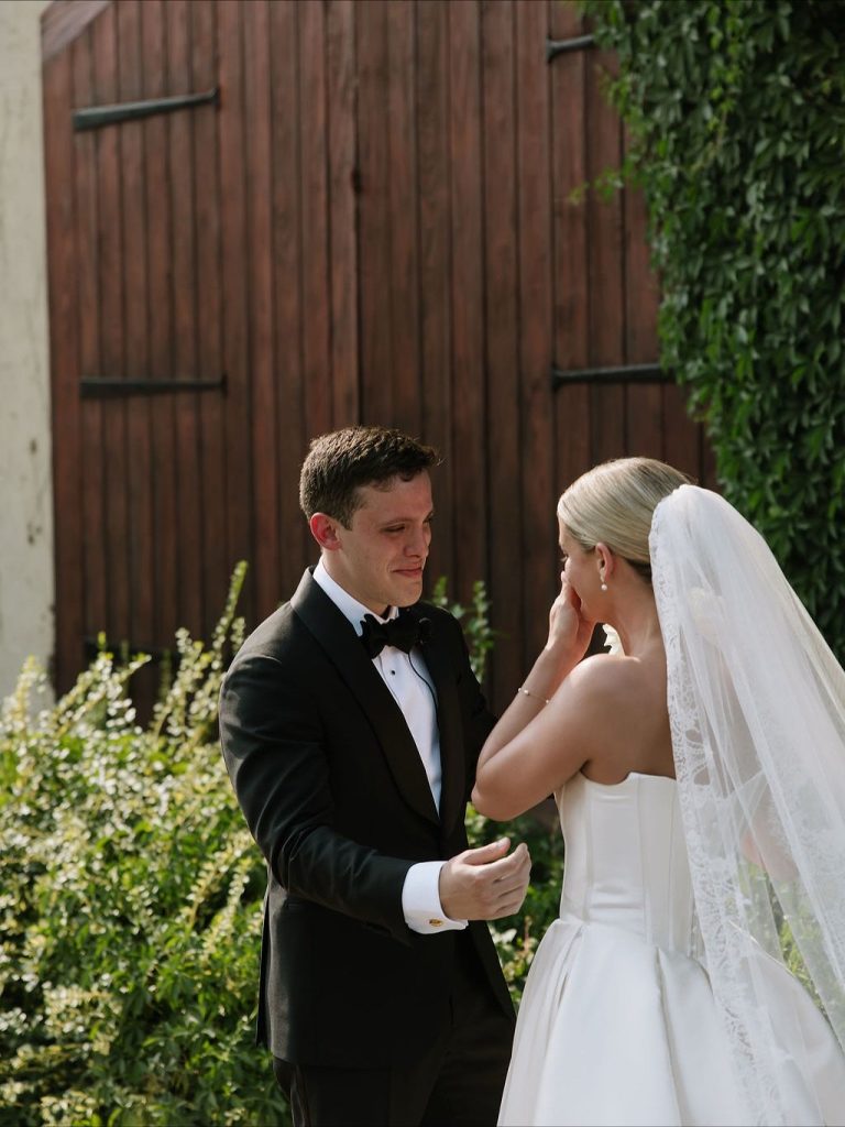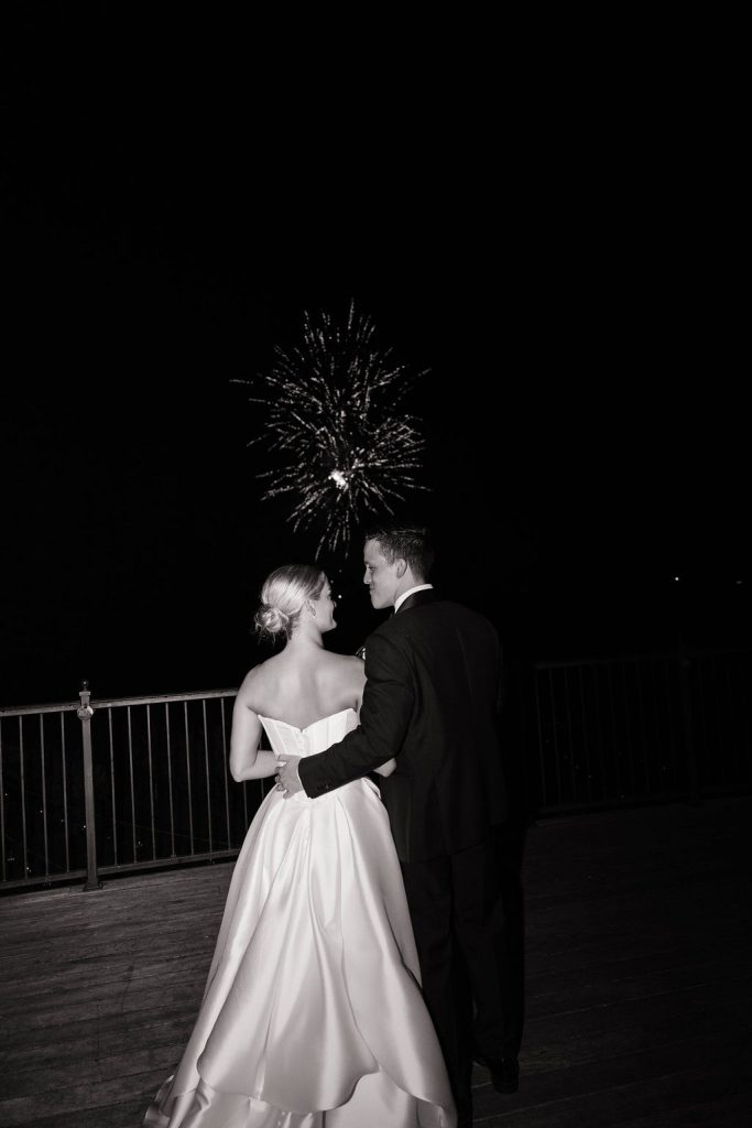 Taylor and Ricky’s wedding day was a blend of classic elegance and modern sophistication. They were married in a beautiful outdoor ceremony at Chandler Hill Vineyards. The bride stunned in a timeless, strapless satin gown featuring a structured corset bodice and a dramatic high slit, complemented by a bouquet of white roses. The groom matched her look perfectly in a classic black tuxedo and bow tie. The emotional day, from the intimate moments of getting ready to their joyous first dance on the checkered floor, was captured beautifully by Films by Victoria. The celebration ended in a dazzling fireworks display.
