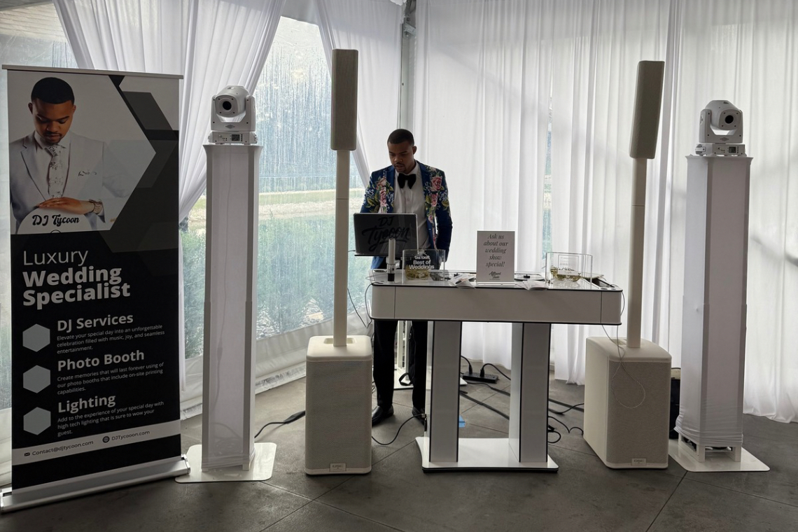 DJ Tycoon and his team specialize in personalized musical experiences—crafting playlists that tell your love story through sound. From heartfelt ceremony moments to packed-dance-floor celebrations, every set is designed to capture your unique energy and vision. Their standard wedding package includes a full professional sound setup, wireless microphones, MC/hosting services, and dance-floor lighting, with premium enhancements such as venue uplighting, cold sparks, “dancing on the clouds,” photo booths, and live instrumental fusions.