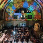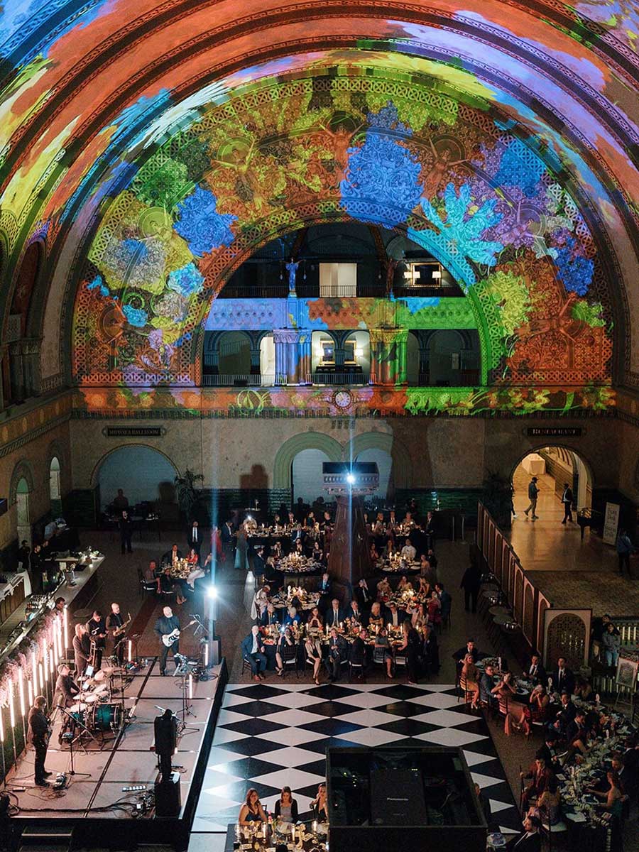 The Grand Hall, with its sweeping archway, fresco and gold leaf detailing, mosaics and art glass windows, stands 65 feet at its tallest point. One can imagine the incredible impression the room created in 1894 on opening day.